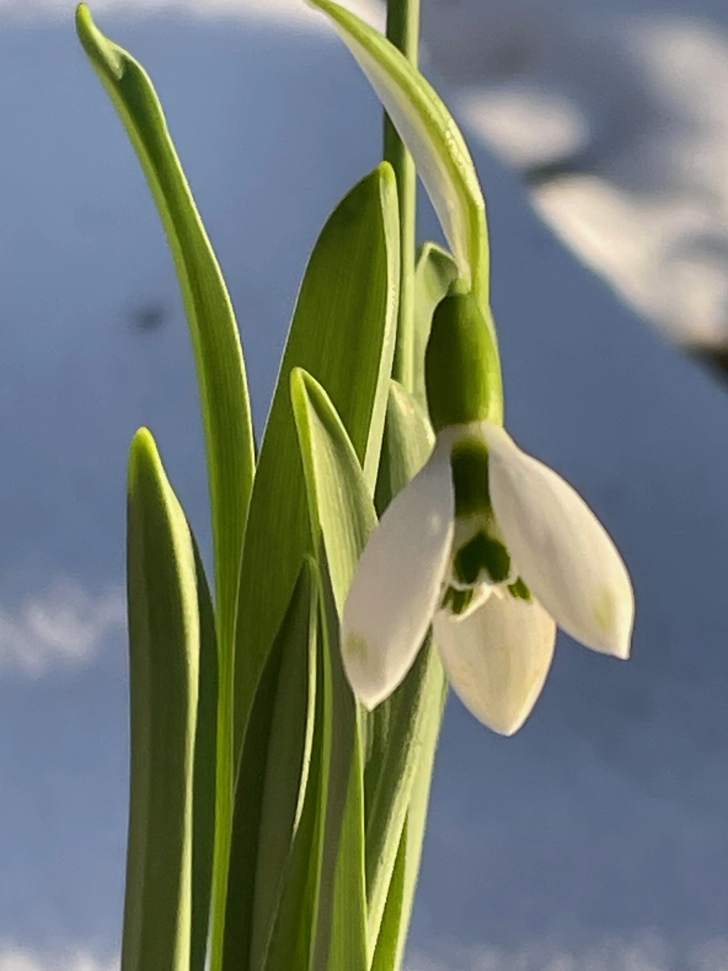 Galanthus elwesii. Den turkiska snödroppen med två märken på de inre kalkbladen och som har bladspetsar som ser ut som en liten hoodie.
